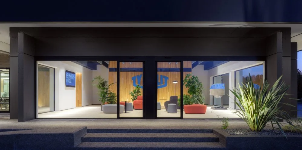 Esterno di un edificio moderno con ampie vetrate, illuminato di sera, con piante decorative e sedute interne visibili dalla strada.